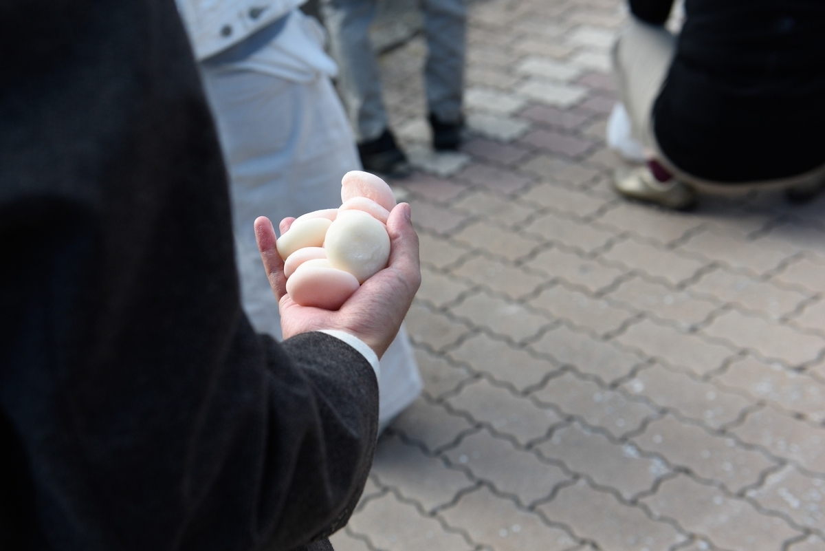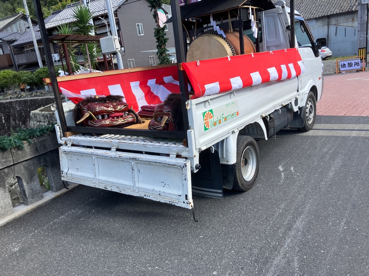 神輿に先んじて獅子舞のような生き物が舞い出した。その舞い方は非常に簡単なもので、少し舞ったかと思うと、観客の頭を噛んで、颯爽と退出していった。観客たちは写真を撮りたいからポーズしてくれといい、渋々少し立ち止まっていた。それで少しだけ観客の頭をまた噛んで、橋を渡ってその先にあった軽トラの2台に積まれた。ただ、それだけでその時の役目を終えた。それから神輿が3基、大きな柱の周りを上下に揺らされながら運ばれ、そして、その後は巫女が通ったり餅まきが行われたりした。