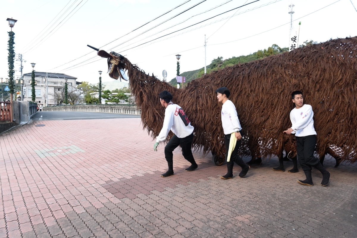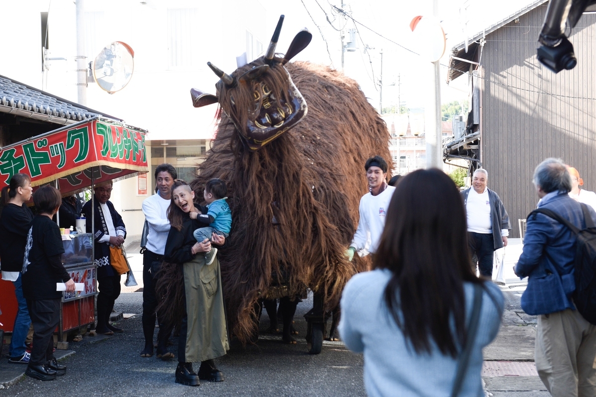 家の前を通る時は、「〇〇さま、〇〇」と掛け声をかけて牛鬼は通り過ぎていく。一軒一軒舞って歩く獅子舞と異なるのは、舞うというよりかは挨拶をして回っているような感覚なのだと思う。ただ、観客の頭を噛む所作がたまに見られたのは、牛鬼がどこか獅子舞という意識があるからではなかろうか。首が揺れると舌も揺れる感じがとても可愛らしいと思った。あと構造として興味深いのは牛鬼の胴体の中に入り動かす人と、外で方向性を修正する、あるいは支えるような役割の人がいるということ。この内と外の担い手の連携プレーによってこの巨大な躯体が動いているのである。時には町の人でない外部から来た若い女性に、「中入ってみるか?」と聞くこともあった。外の担い手は美味しい焼き鳥か何かの串を持ちながら、フランクな身のこなしで牛鬼を支えていた。