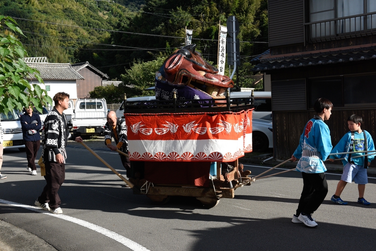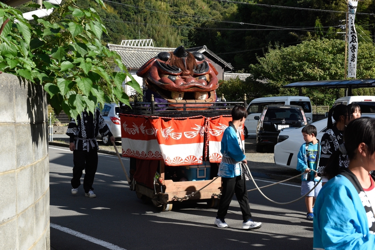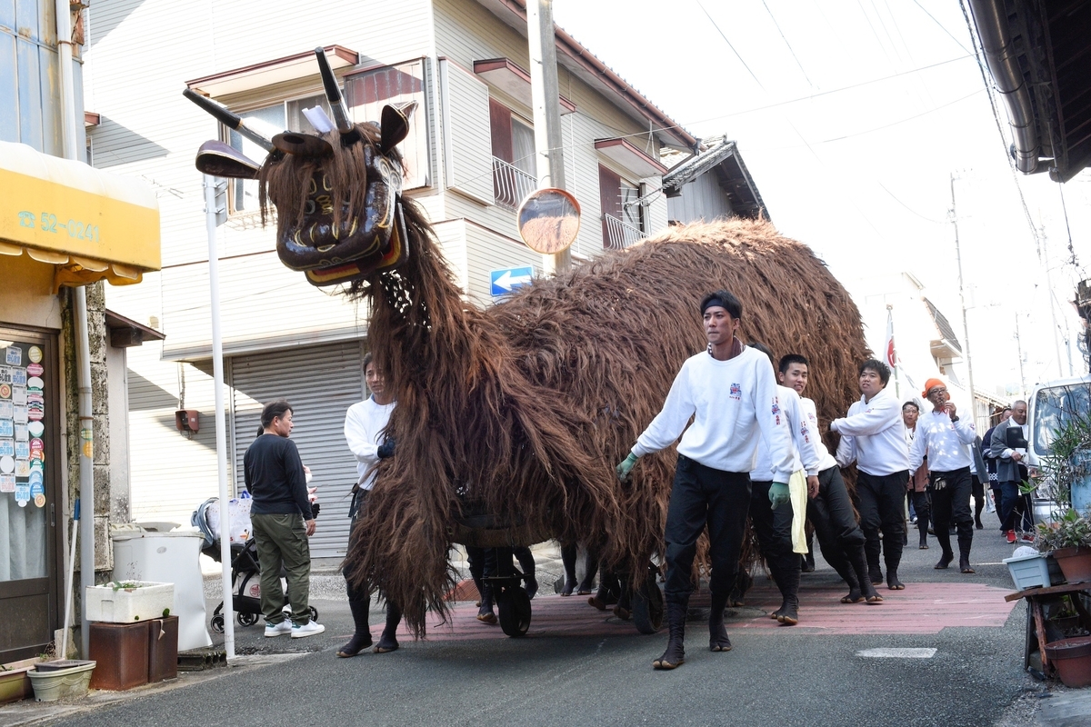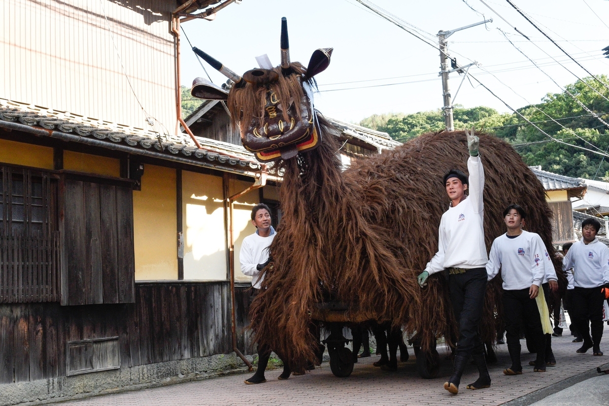 神輿の先払い以外で舞う事がないそうで、舞う瞬間を少しだけ拝見できたが、全然撮影ができなかった。角があって角張っている感じが牛鬼にも近いような気がする。非常に謎なのがなぜ大量にその姿を消したのかということと、二足歩行でなぜ手を外に出さないかということである。
