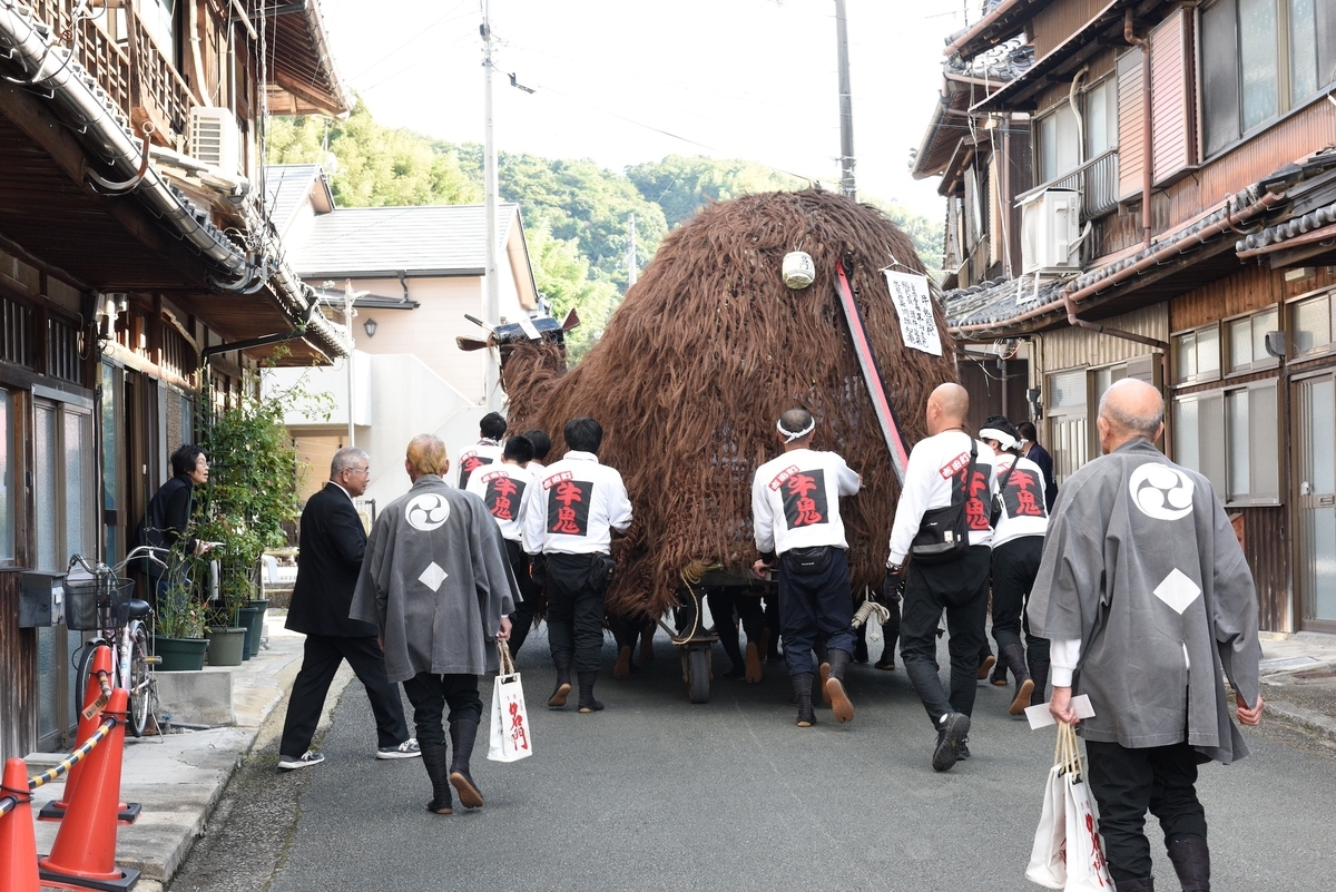 牛鬼の門付けはとても印象的だった。牛鬼がまいりましたー!などと言って玄関を開いて挨拶をする。もう挨拶が終わる頃には牛鬼は通り過ぎている。牛鬼はとにかく歩くのが早い。なかなか追いつけなくてたまに走ることもある。